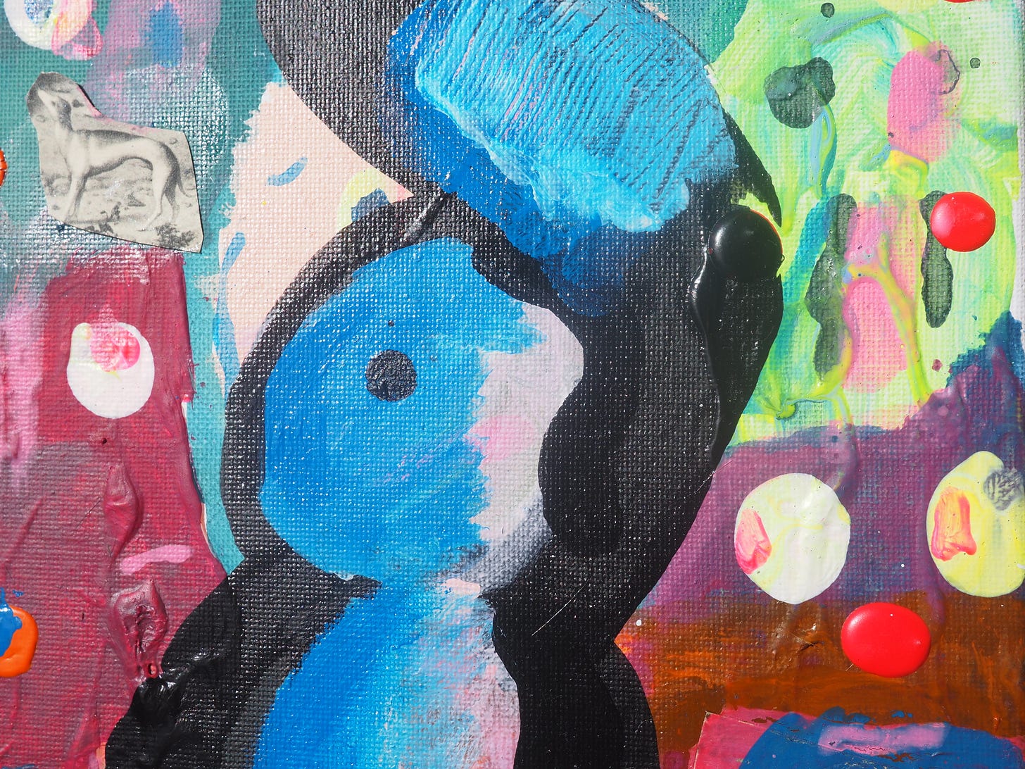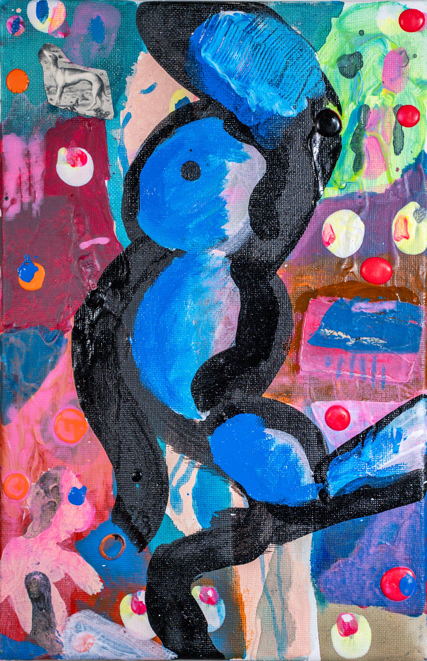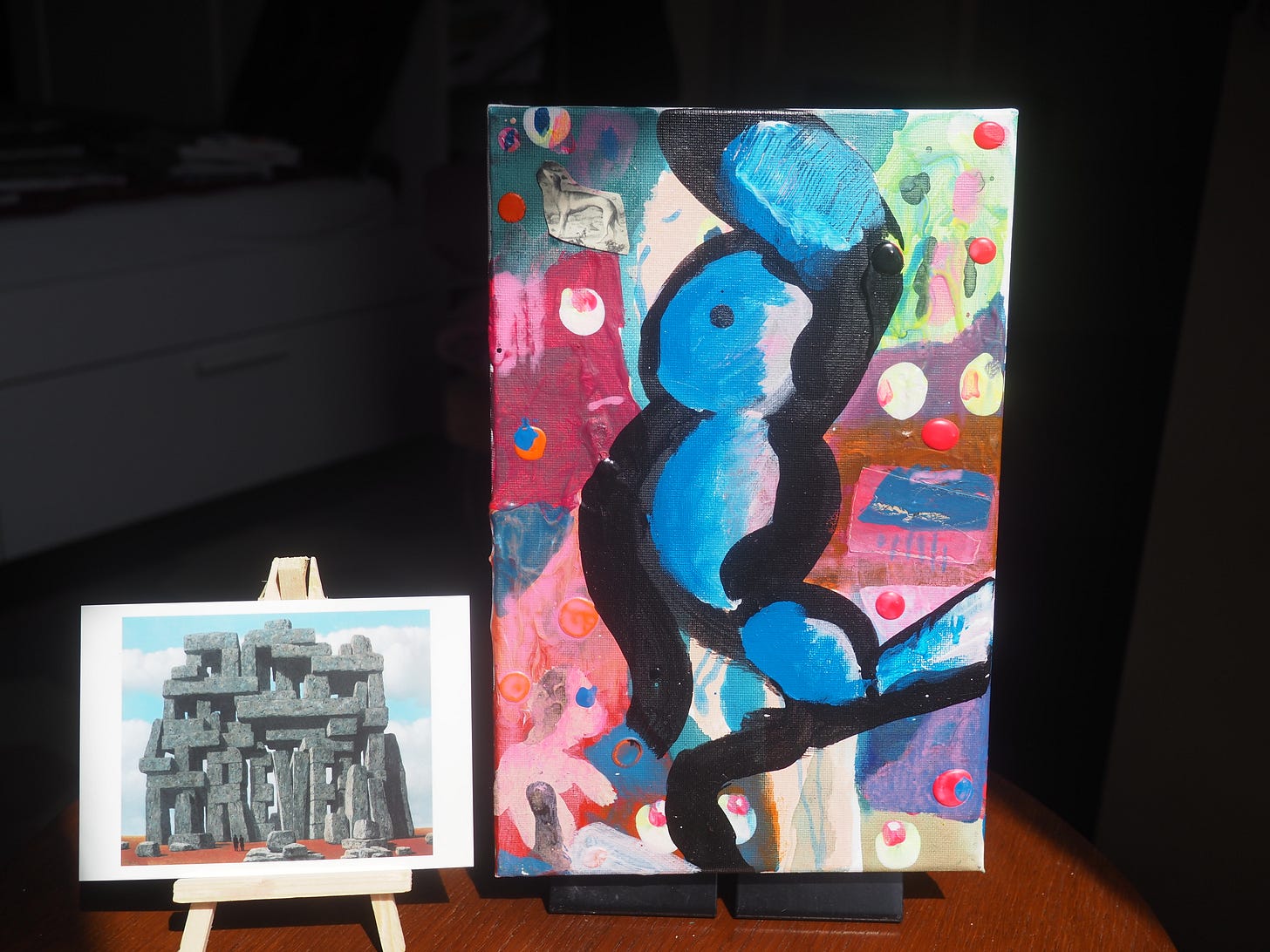 Dance In Lizard LandMay 04, 2025ShareTranspersonal Making Team, Dance in Lizard Land, acrylic on canvas, 2024, CT073, 20cm x 30 cmThe painting next to the postcard (10.5 x 15 cm) of René Magritte’s The Art of Conversation.