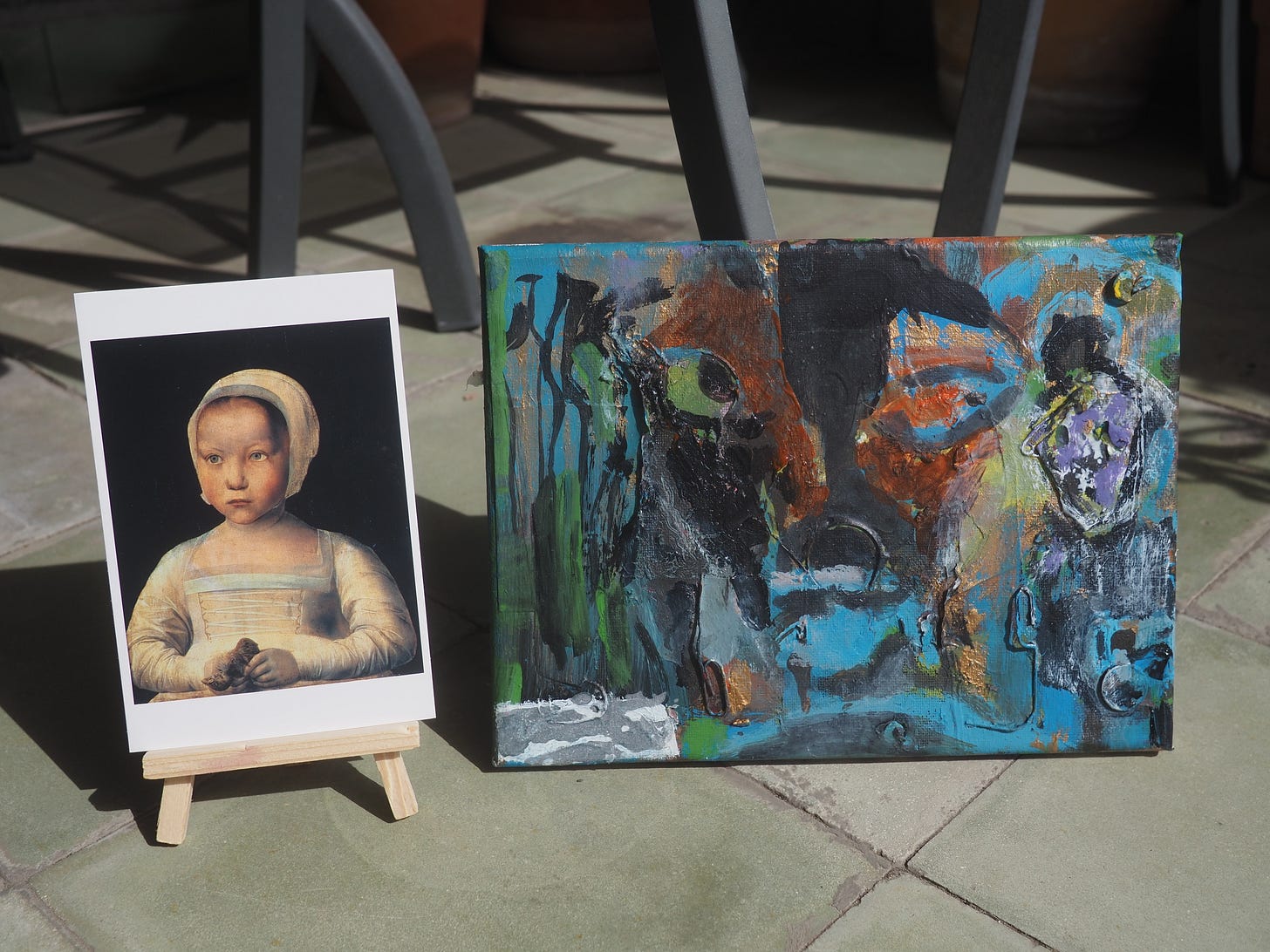 Fox Facing Friendly FearMay 05, 2025ShareTranspersonal Making Team, Fox Facing Friendly Fear acrylic and collages on canvas 2024, CT011 24cm x 18cmThe painting next to the postcard (12 x 17 cm) of La filette à l’oiseau mort by anonymous painter in Royal Museums of Fine Arts of Belgium