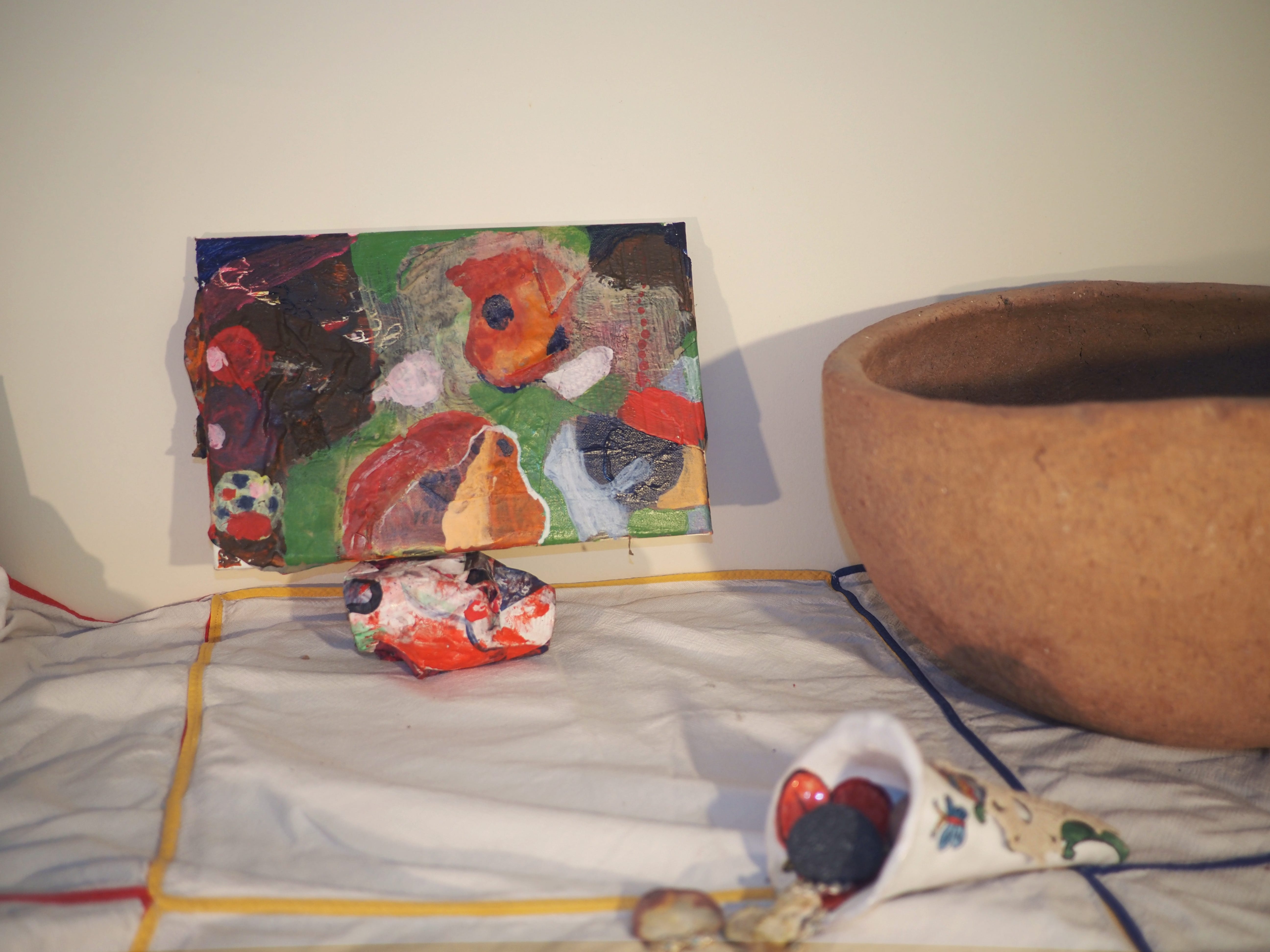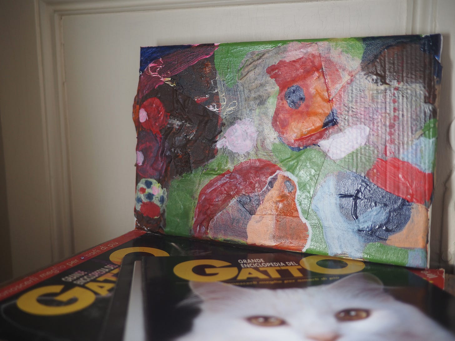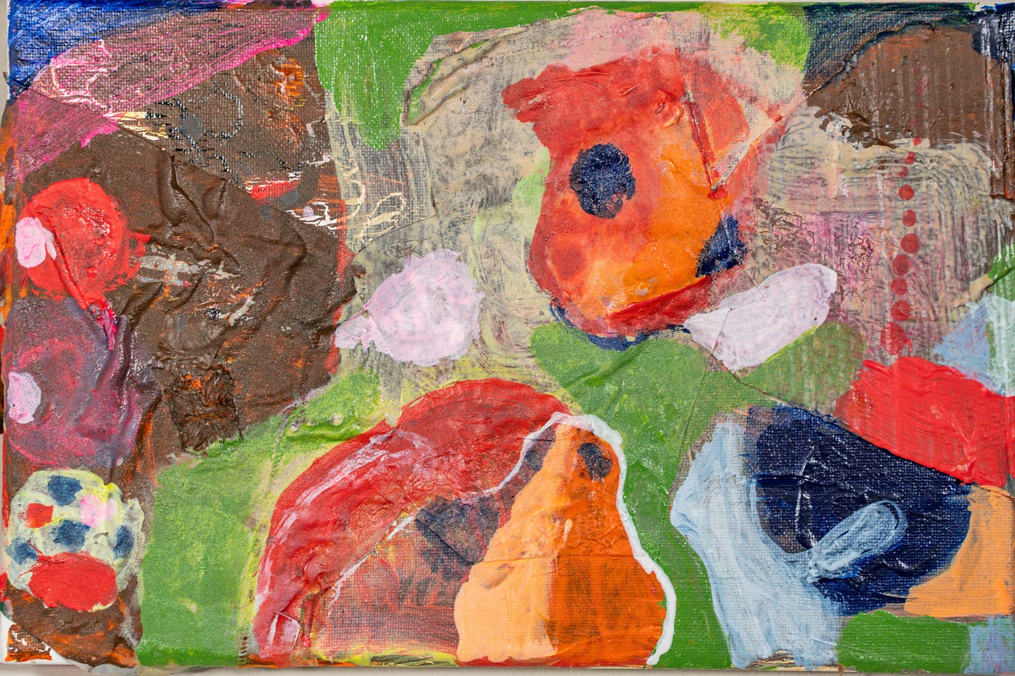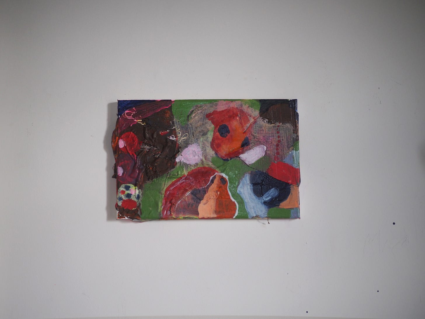 Transpersonal Making Team, Intellectual Picnic, acrylic, and collages on canvas 2024, CT093, 20cm x 30 cm