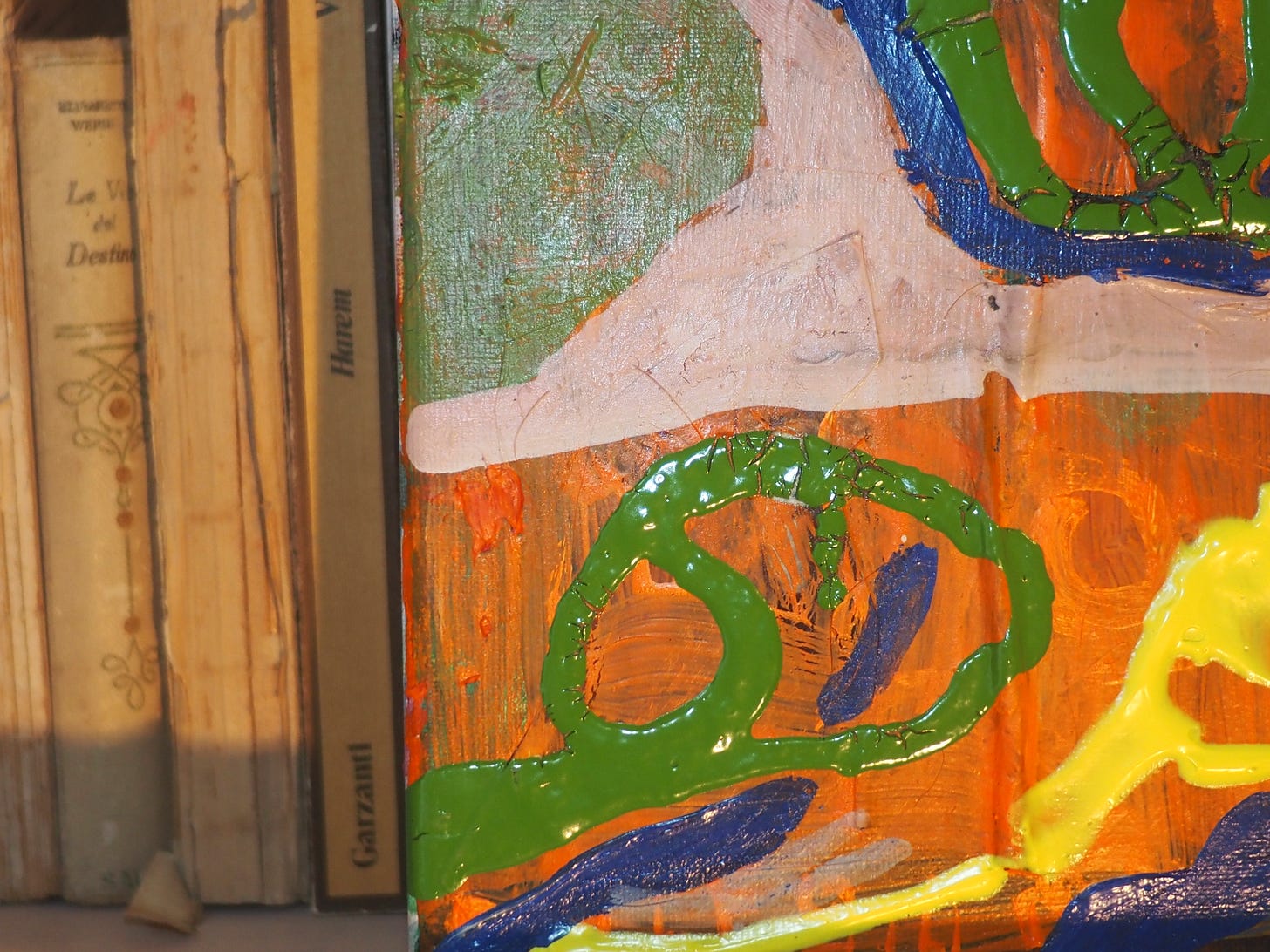It reflects the quietest moment of a chaotic space, the serene and definite leaves sits on top of layers of paint, hushed by the atmospheric gold orange hue. What is happening behind the orange background?