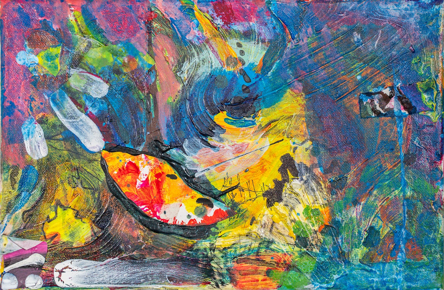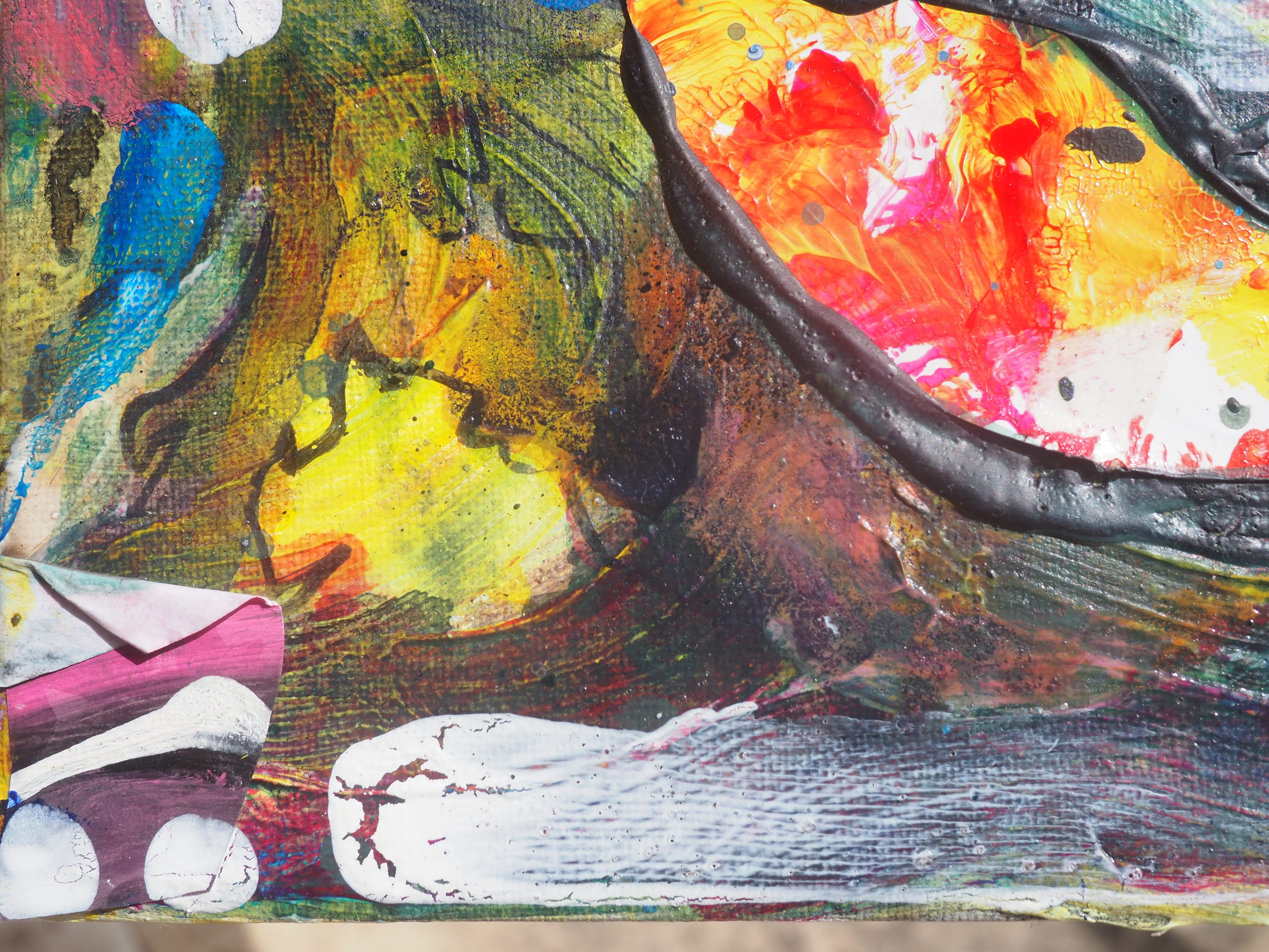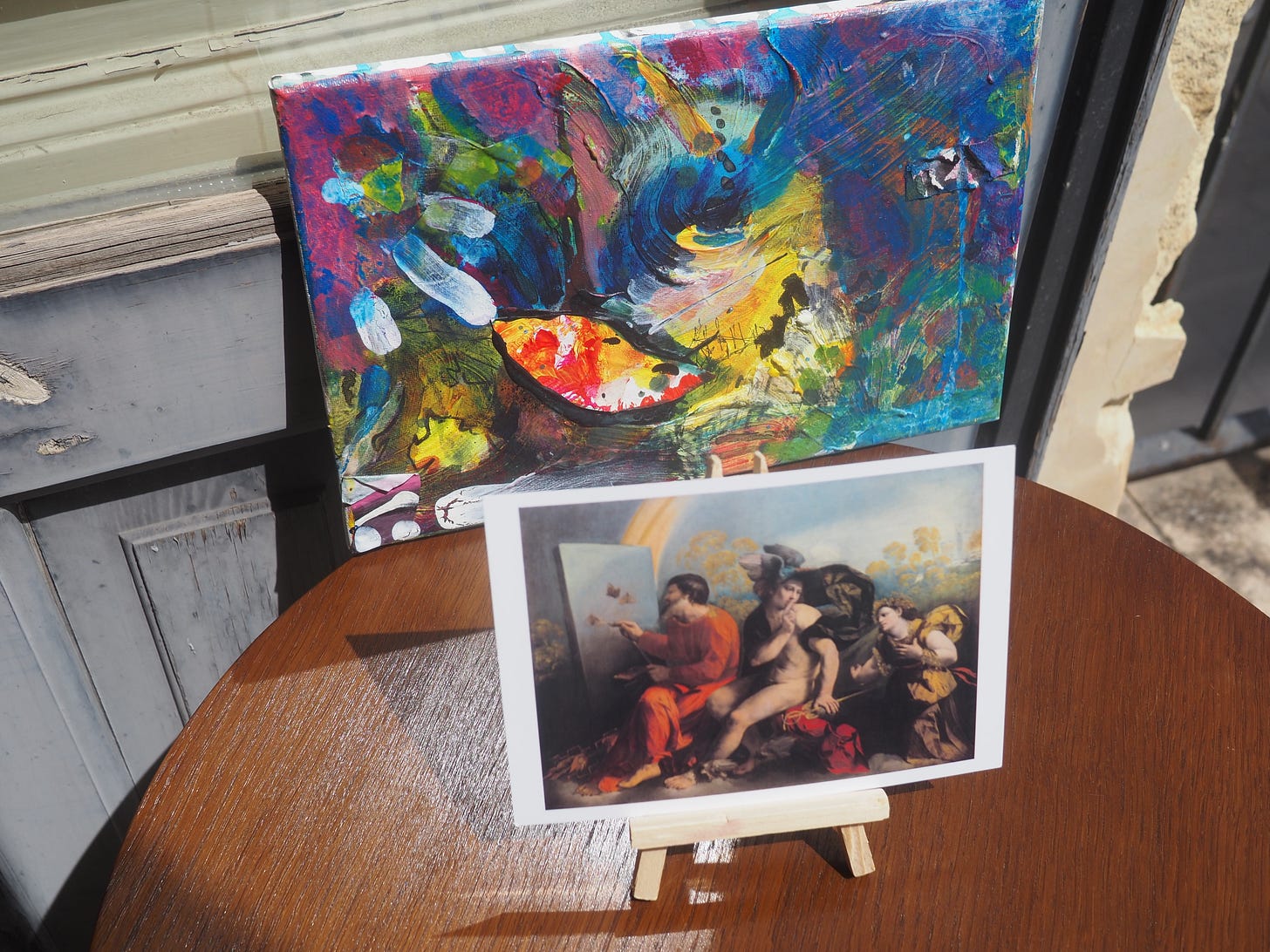 Parisian Pool May 05, 2025ShareTranspersonal Making Team, Parisian Pool, acrylic and collage on canvas 2024, CT008 30cm x 20cmThe painting next to the postcard (12 x 17 cm) of Jupiter, Mercury and Virtue by Dosso Dossi