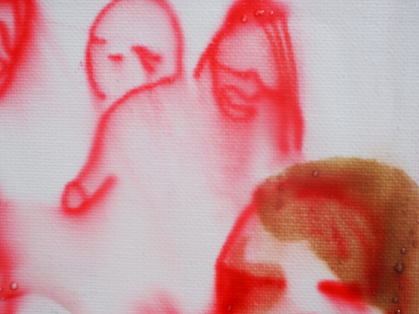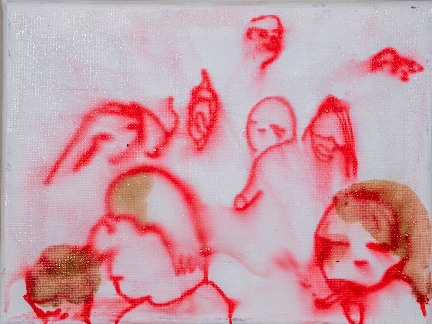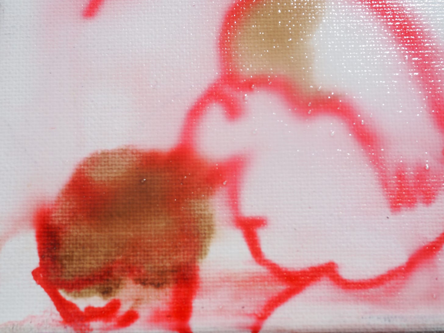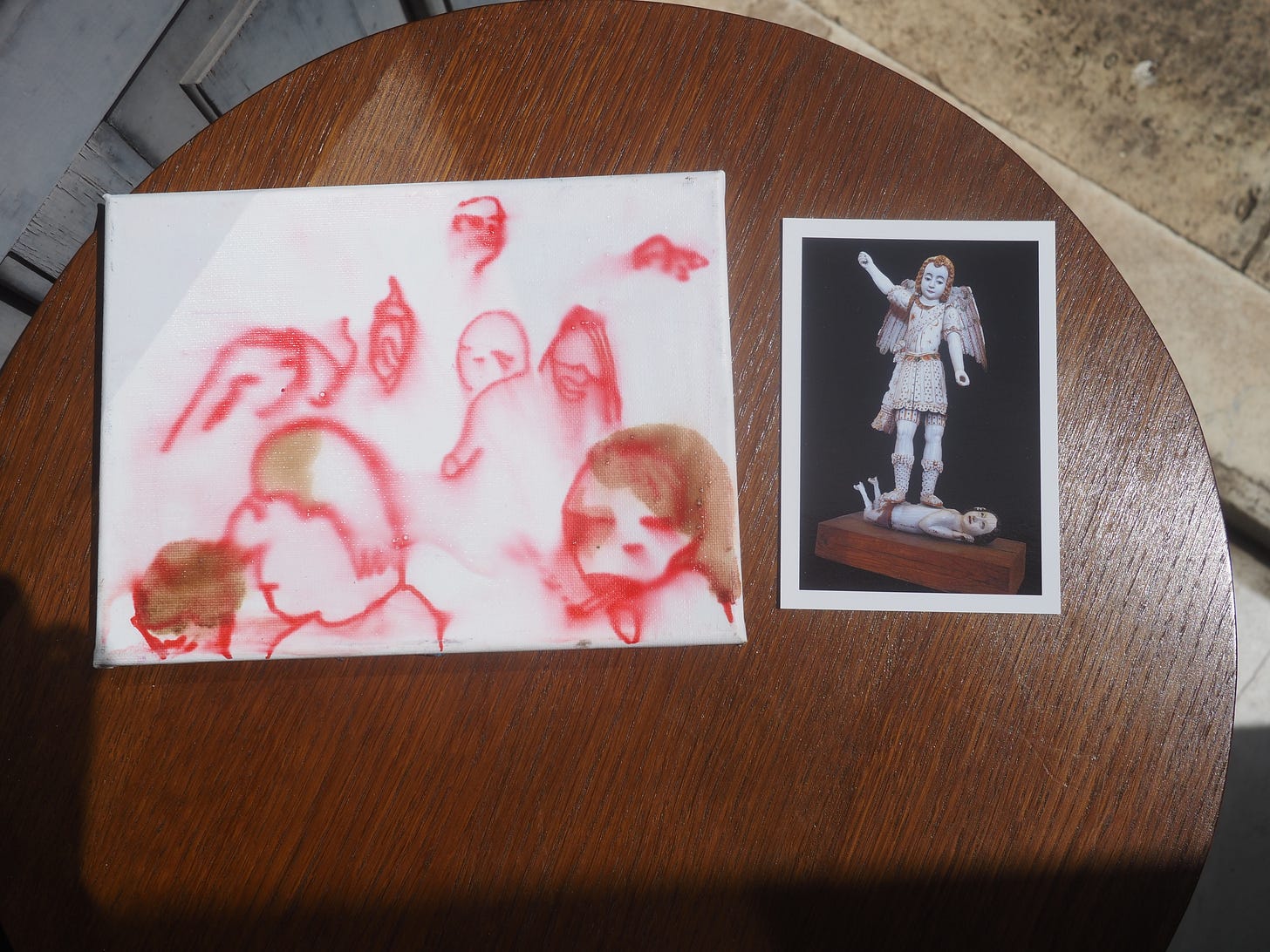 Red MarketMay 05, 2025ShareTranspersonal Making Team, Red Market, acrylic and coffee on canvas 2024, MKT01-CT010 24cm x 18cmThe painting next to the postcard (12 x 17 cm) of a statue of archangel in the Museum of Convento de San Esteban in Salamanca
