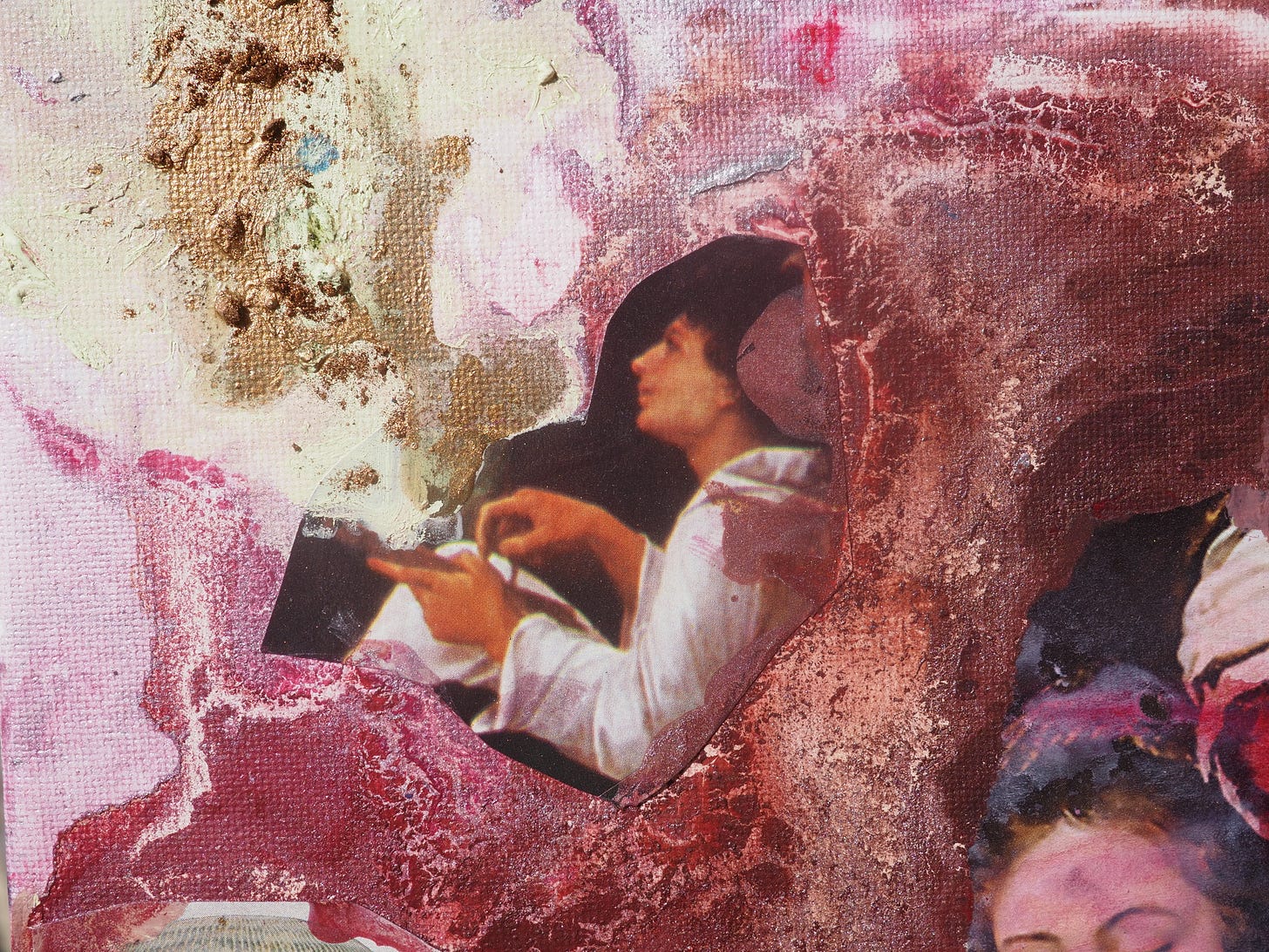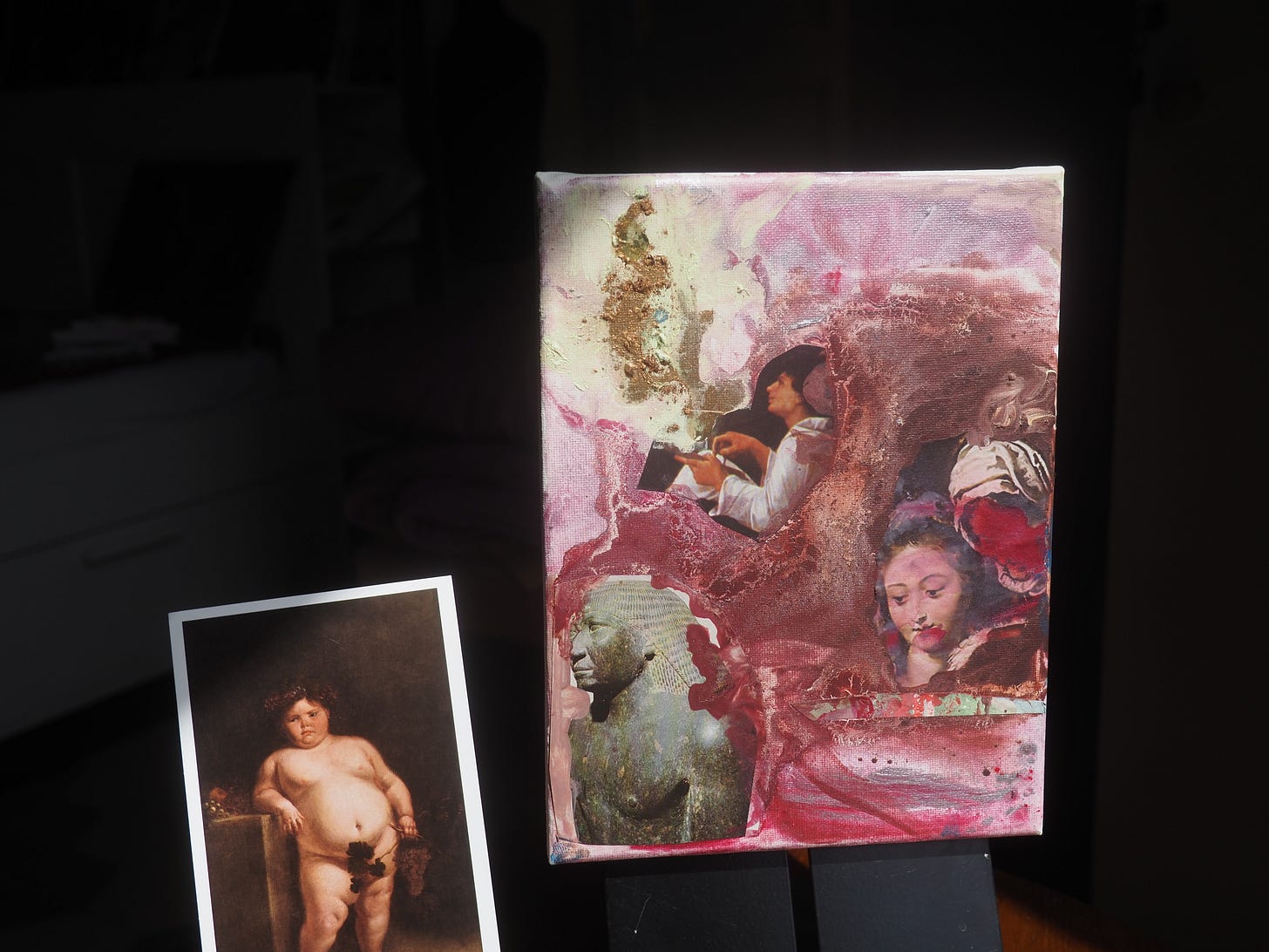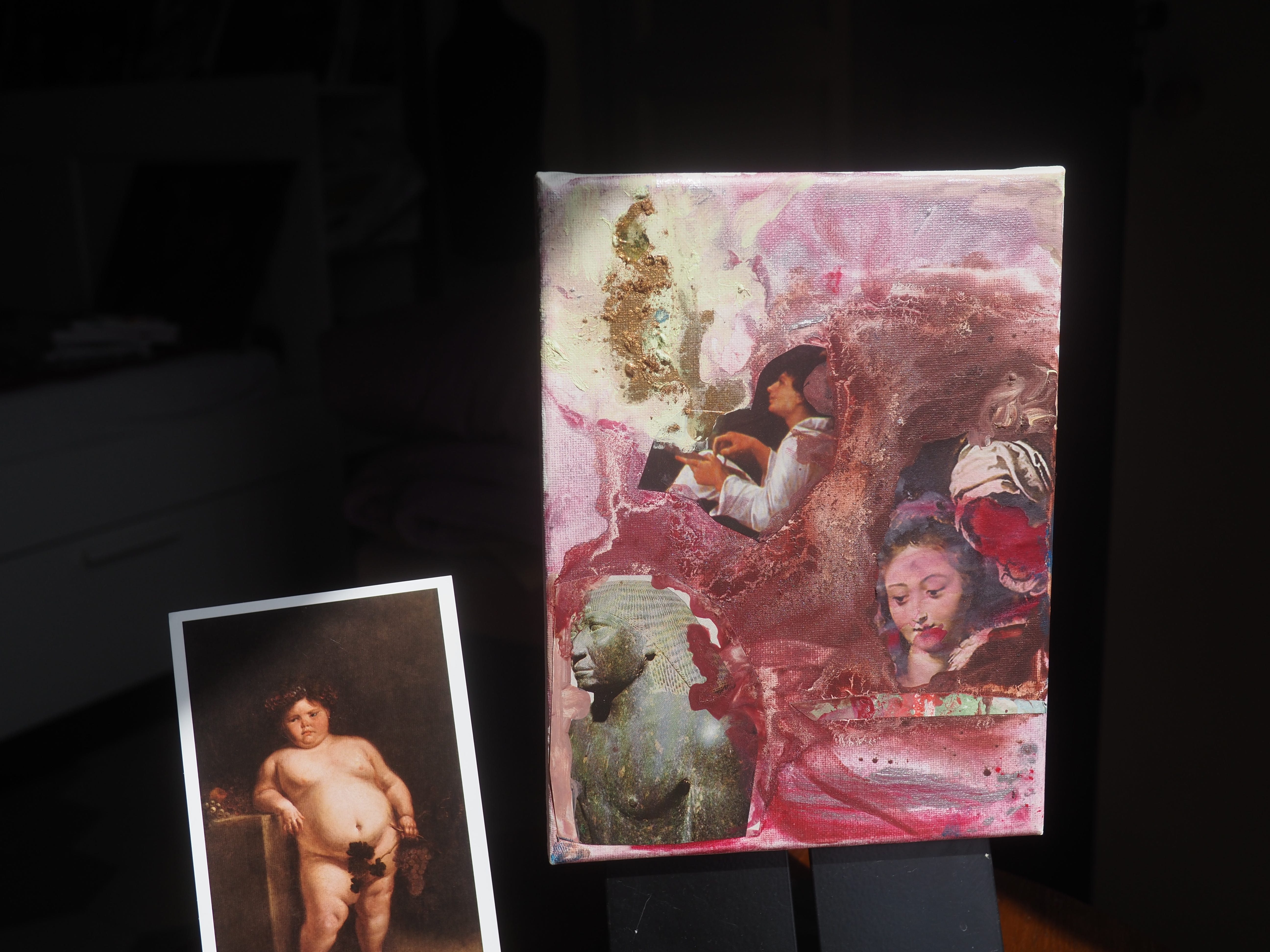 The Museum DreamsMay 04, 2025ShareTranspersonal Making Team, The Museum Dreams, acrylic and collage of paper on canvas 2024, CT071, 18cm x 24 cmThe painting next to the postcard (10.5 x 15 cm) of Juan Carreño de Mirand’s Eugenia Martínez Vallejo, nude, in Prado Museum in Madrid.