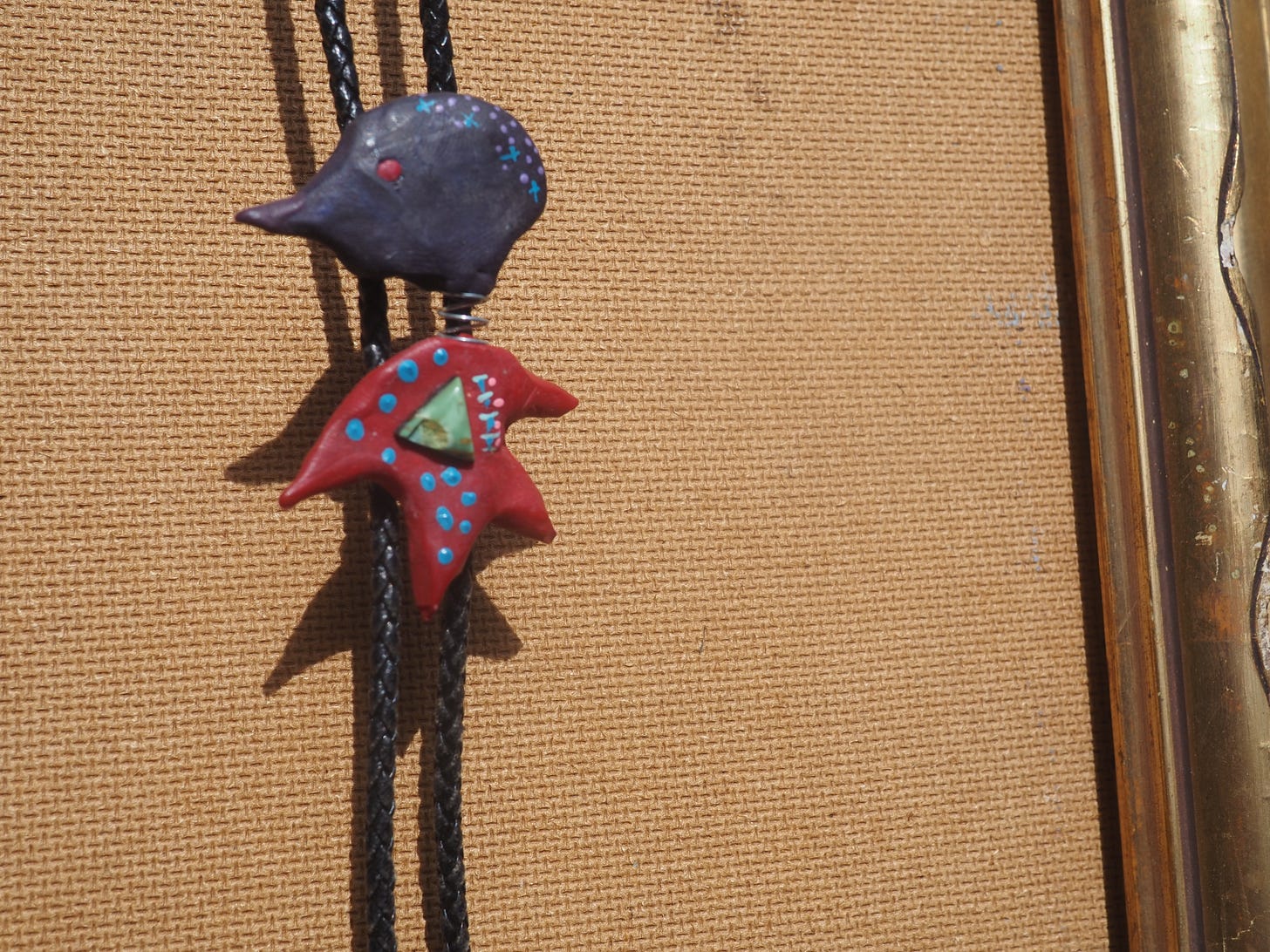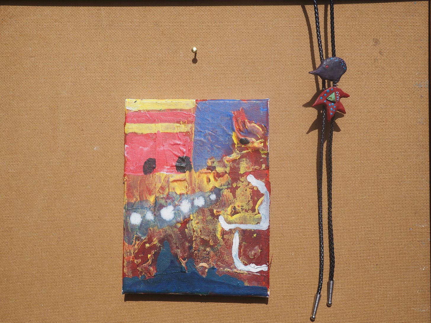 The Bolo tie next to the painting is handmade by mosaic artist Jody Jaffe