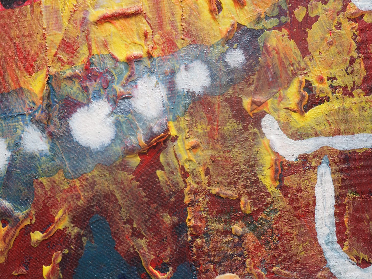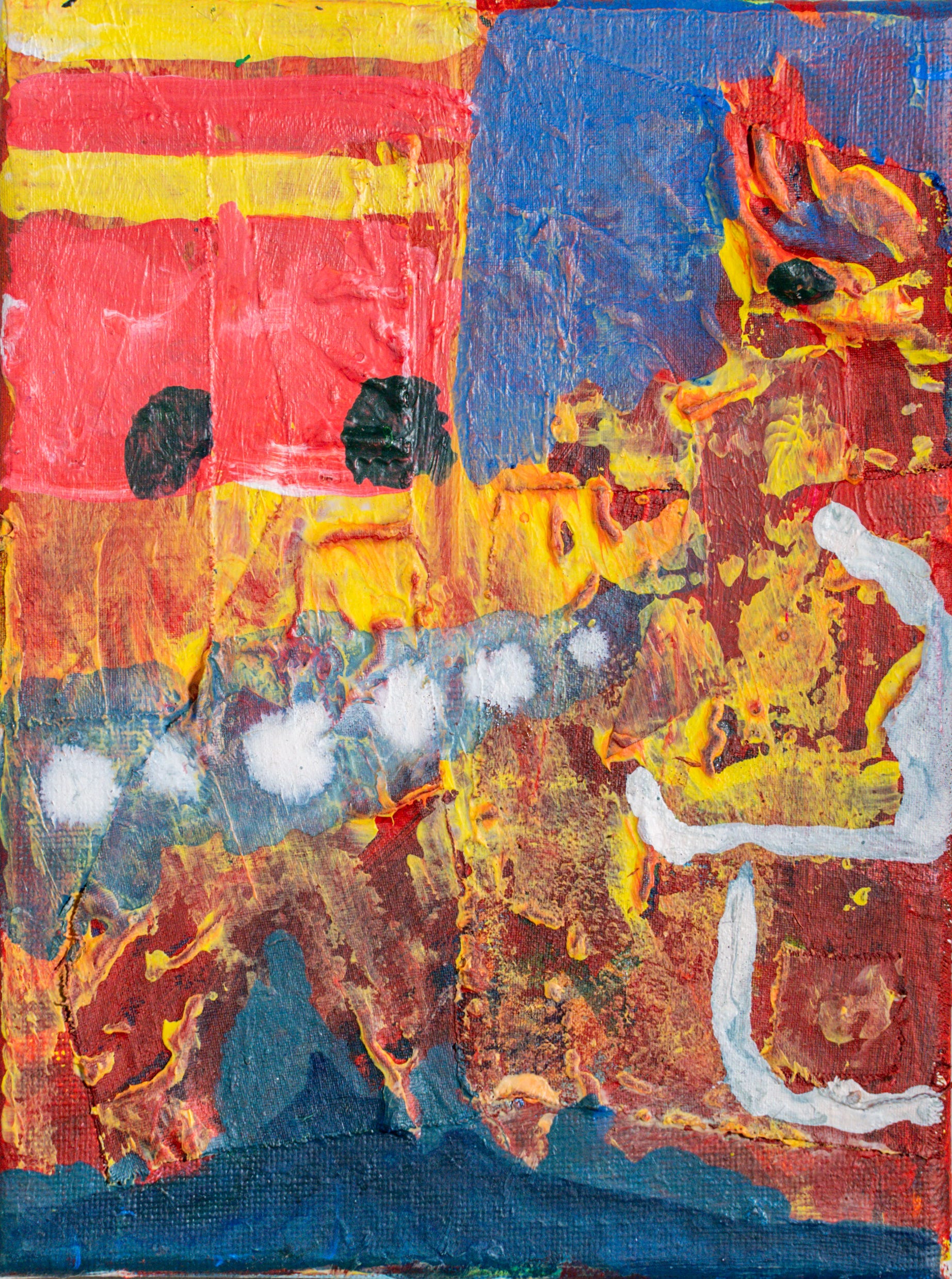 Transpersonal Making Team, Senyera Firefighter, acrylic and collage on canvas 2024, CT042, 15 x 20 cm
